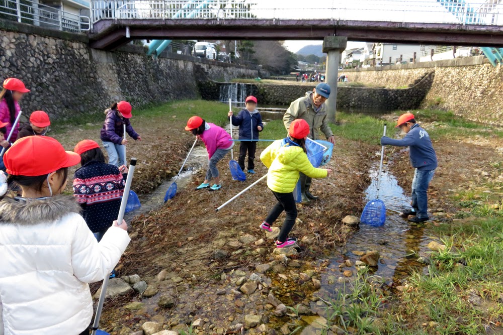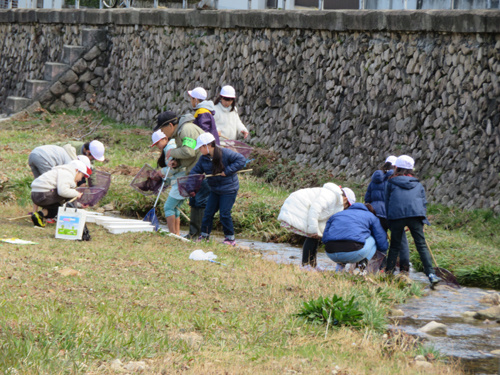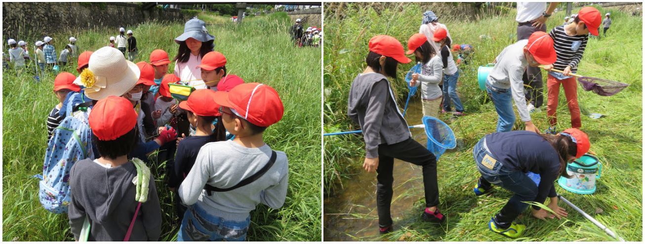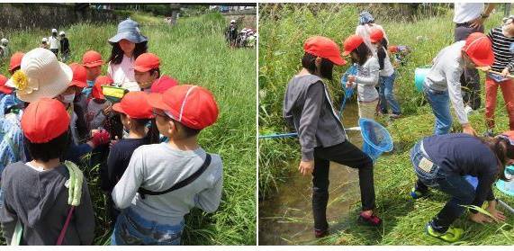 西山小学校の3年生のみんなと学校の近くを流れる逆瀬川で生き物探検をしま