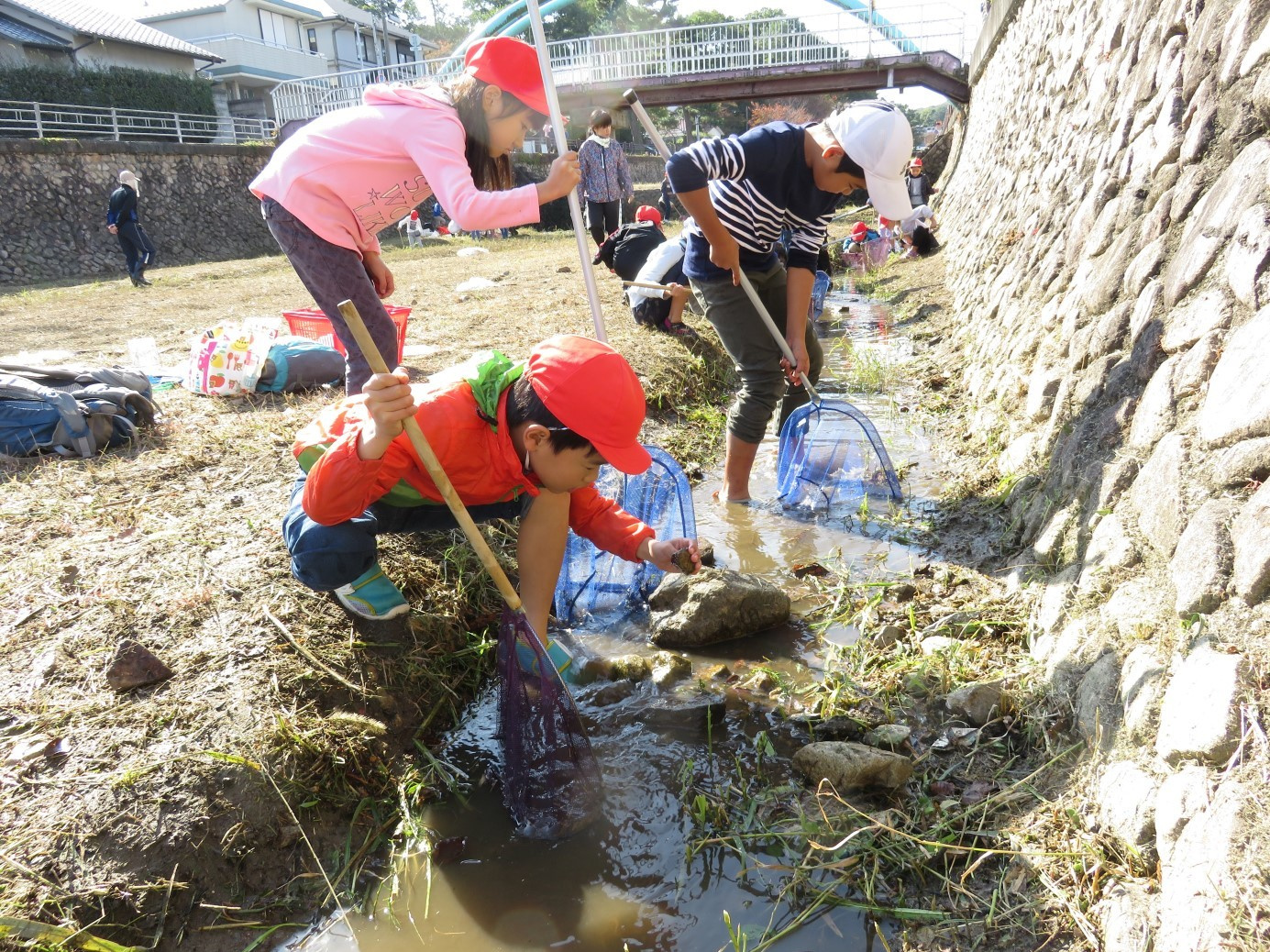 秋晴れの青空のもと、学校近くの逆瀬川で水の中の生き物探検をしました。