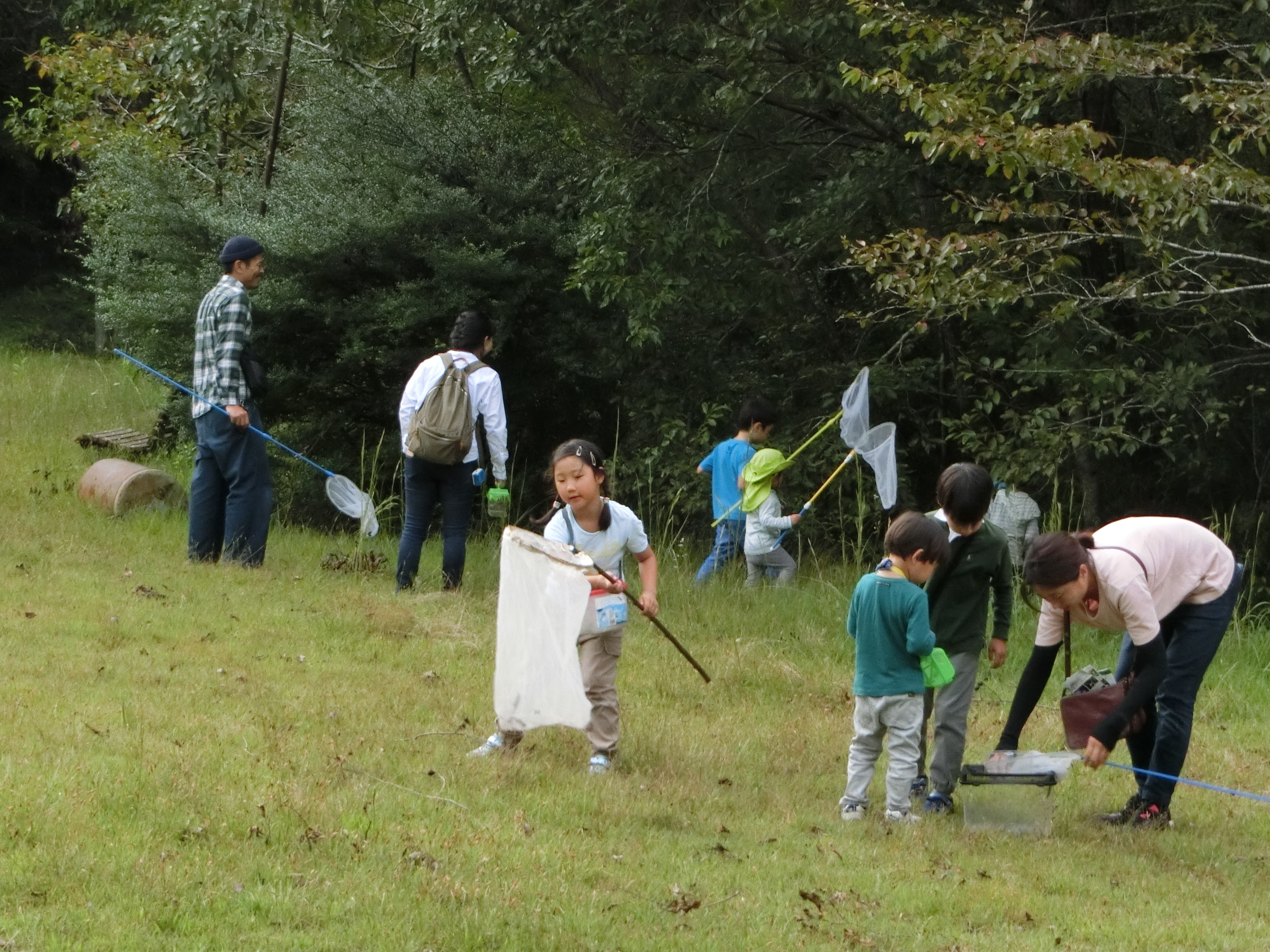 1部は、自然の家の敷地内で、虫とり大作戦。あちこちで、「バッタとった」「コオロギとった」の歓声の中で、「ショウリョウバッタ」と「ショウリョウバッタモドキ」、「エンマコオロギ」と「ツヅレサセコオロギ」など大人顔負けの正確さで特徴を見極めて名前を言える子もいて、その昆虫博士ぶりにびっくり。ナツアカネが山から下りて来て枝先で羽を休めているのを見つけ、背伸びをして「やったー!」と採る姿も。大人も子どもも虫採りに興じました。