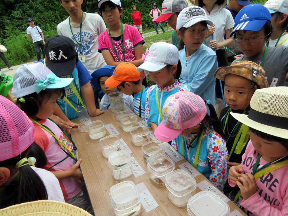 岸辺や石の下から生き物を見つけ「カニとったー」「パパこれ取って」と魚やカニ、水生昆虫類をつかまえました。採取された生き物は、全26種、サワガニ、ヘビトンボ幼虫の数が多く、水質階級「Ⅰきれいな水」と判定。