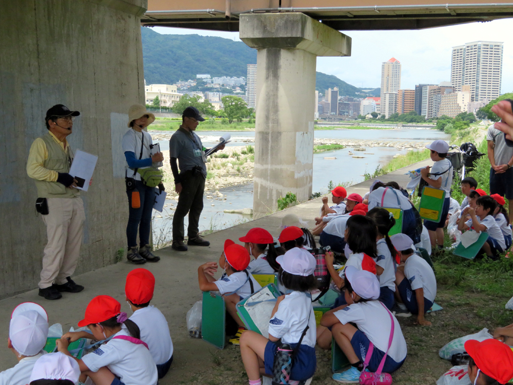 河川敷に降りる階段や川の中での活動は、スタッフたちが安全第一で見守りました。紙芝居で水質と生物の関係の話を聞き、網を使っての生物の取り方説明の後、「ヒャー冷たー!」と言いながら子供たちは川に入っていきました。