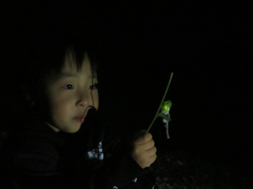自然の家近くに戻って、「来年も美しい姿を見られるように捕まえたホタルを自然に帰してあげましょう。」と伝えると、小さなお子さんは「ホタルさん、ありがとう。」の声とともに、お母さん方は「たくさんかわいい赤ちゃんを産んでね。」と。自然を大切にしようというその声は、ホタル以上に感動的に心に響きました。