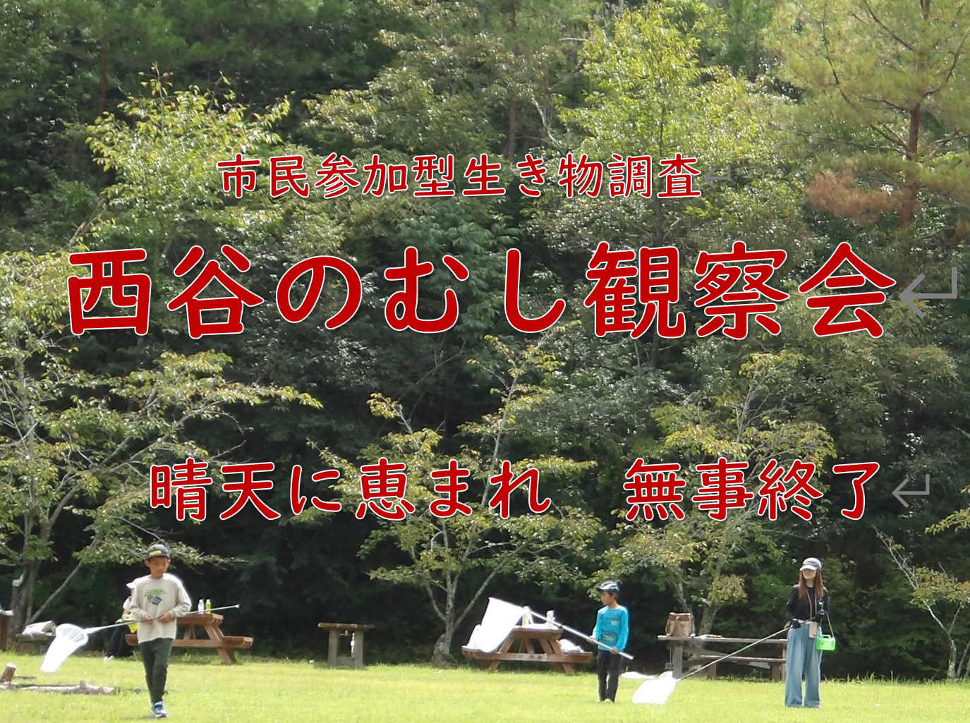 ここに概要を思い出アルバム及びとれた昆虫一覧(昆虫調査結果)とともにお知らせ致します。しかし、系統分類上昆虫には属しないクモ類、軟体動物、両生爬虫類など子どもたちが捕獲した小動物も記録しておりますが、統計上は除外しております。