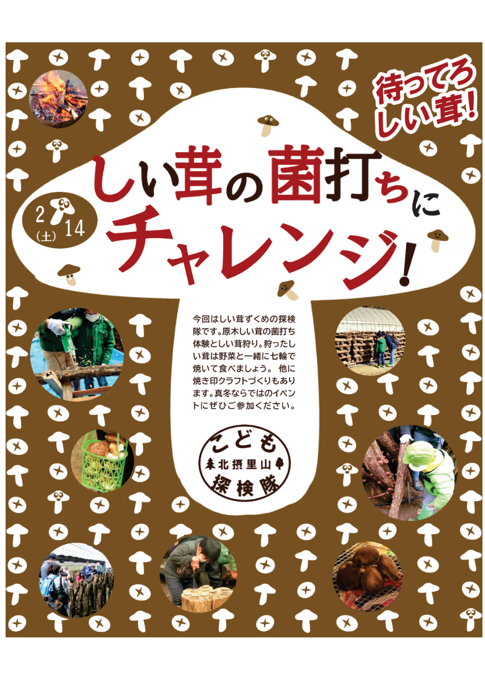 | 【対象】 | 阪神地域及びその周辺の小中学生(保護者同伴) しい茸の菌打ち体験のほだ木を持ち帰り可能な方 |